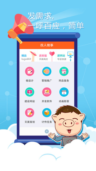 猪八戒网-中国最大的创意和在线服务交易平台,超过1000万的注册服务商在这里提供创意,开发,设计,推广等各类服务满足企业和个人的服务需求。猪八戒雇主版App,可以帮助您第一时间解决需求,随时随地都能方便找所需要的服务。