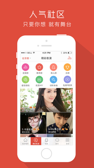 - 曲库丰富、曲目更新及时,唱你所想,享你所唱人气社区:只要你想,就有舞台