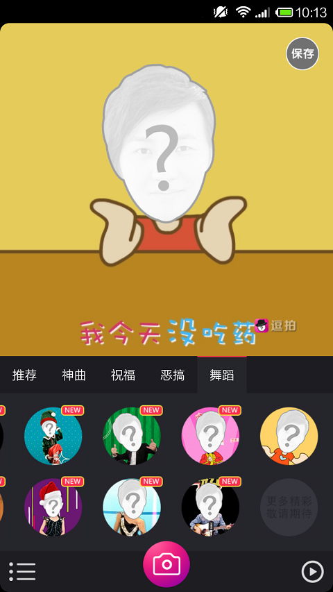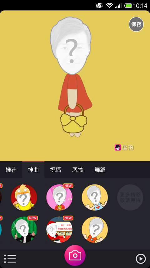 逗拍主打“有趣、简单”,提供各种好玩的场景,用户可以上传个人头像制作各种好玩视频,让自己成为场景中的一角,可以是祝福、恶搞、调侃等各种视频,还能够整蛊一下朋友!