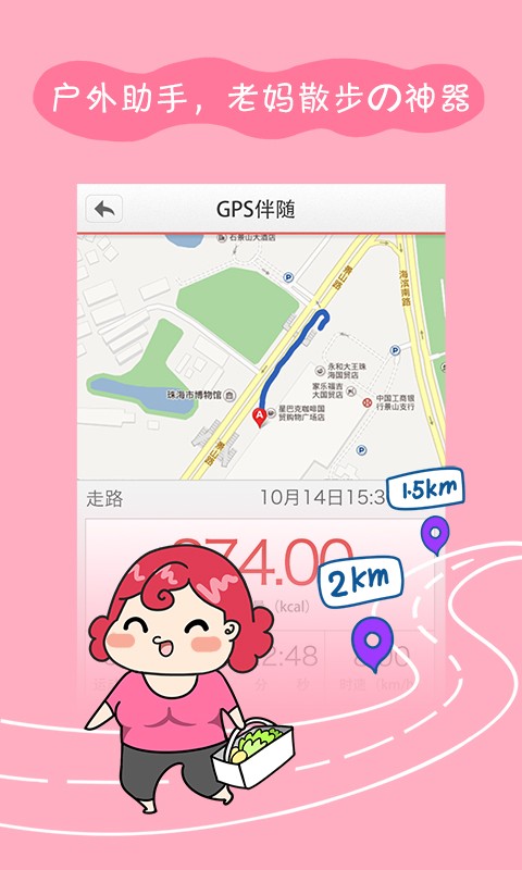 还有专业的GPS户外助手,随时记录胖妈运动的热量消耗;让妈妈在户外散步的时候有超级减肥王陪伴吧~