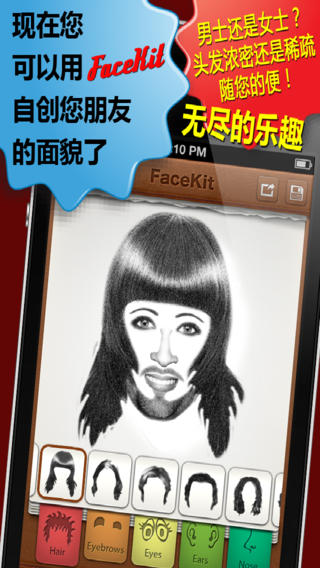 现在您可以用 FaceKit 来自创您朋友的脸了, 并且可以把他们分享到 Facebook 和 Twitter 网站。 男士还是女士? 您可以把他们的脸改成滑稽的或大或小, 秃顶或者长发, 可笑或者令人毛骨悚然, 随便您, 这全看您高兴怎么玩了, 这真是无穷无尽的乐趣啊!