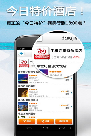 最动感的触觉体验:摇一摇手机,立即搜索身边的酒店,简单有趣。