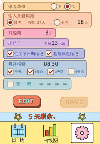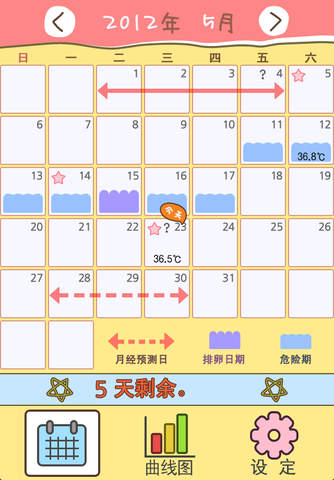 为全世界女性的精心制作。 月经(预测)日、排卵日期、性关系日期、 危险期、基础体温、心情、症状、备忘录等在Supreme 生理日记中简单方便的输入和确认吧。 可自动计算今后6个月的月经预测日和排卵日期(危险期)在日历上标记并提示,方便您进行休假、旅行、结婚、怀孕、避孕等的计划。 所有输入一键式简单方便,几乎包括了所有女性的需要。 无需更多的说明使用简单的用户界面和使用方法, 所有信息一目了然,时尚简单的设计以及专为女性设计的隐私功能真的富有魅力!