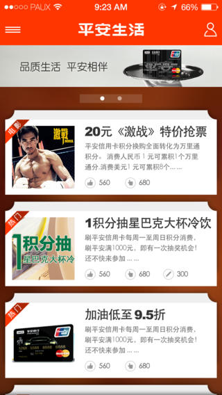 ★ 最新优惠:最新最热的刷卡促销活动,最全最快的商户购物折扣 ★ 手机网银:提供账单、明细、额度查询,以及快捷还款功能,用卡无忧 ★ 手机充值:支持三大运营商,信用卡支付或万里通积分兑换,方便快捷 ★ 电影票购买:手机选座、在线支付,免去影院排队烦恼 ★ 万里通积分,丰富礼品随您选 ★ 平安彩票:在线购买,点亮您千万梦想