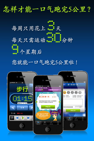 •语音提示会告诉您何时慢跑,何时步行,以及训练前热身训练后放松提醒;