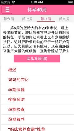 其中包括:概述、妈妈的变化、婴儿发育图、孕期保健、孕期检查、孕期营养、妈妈营养食谱,内容多而且很详细;