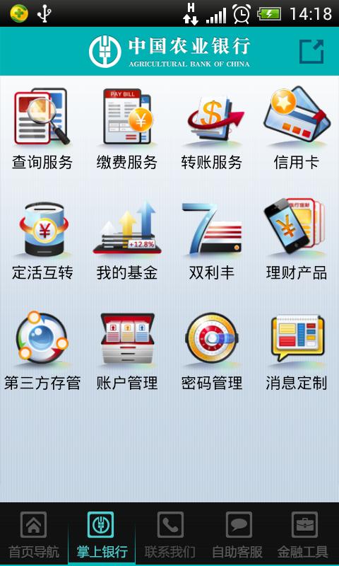 密码管理、 双利丰、信用卡服务、商旅服务、手机商城、农行资讯等。