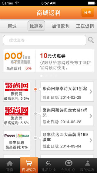 1.快速搜索各大返利的商城和淘宝店铺 丰富的返利商城优惠券、加倍返利、限时抢购、正在促销信息