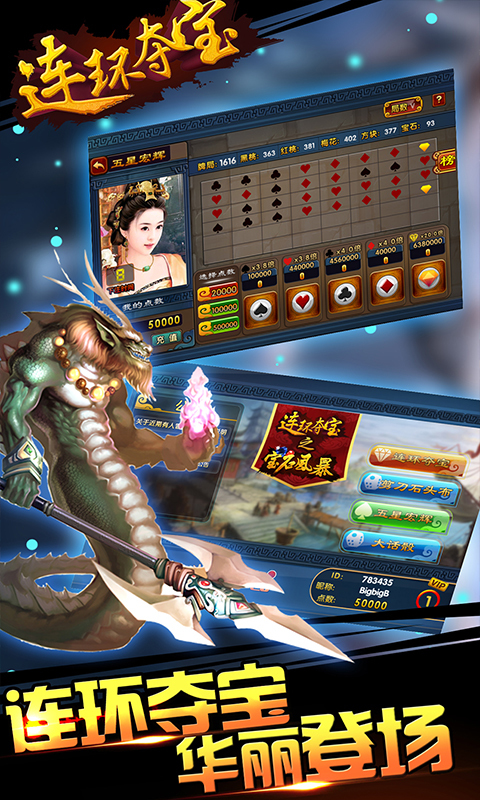 《连环夺宝》是一款非常有趣的游戏。游戏中玩家可以有两种不同的玩法,独特的游戏规则,挑战玩家的人品。有兴趣的玩家不妨下载试一试!连环夺宝安卓版下载,点数进入游戏环节进行游戏,游戏过程结束后,根据游戏点数进入中奖环节,获得相应的点数,一次完成。