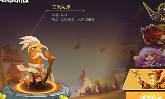 萌神战记是一款以食物为题材的横版动作角色扮演游戏,玉米法师,武器法杖,特点远程法术,大范围爆发,挑战1阶金钱本BOSS!
