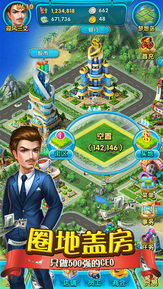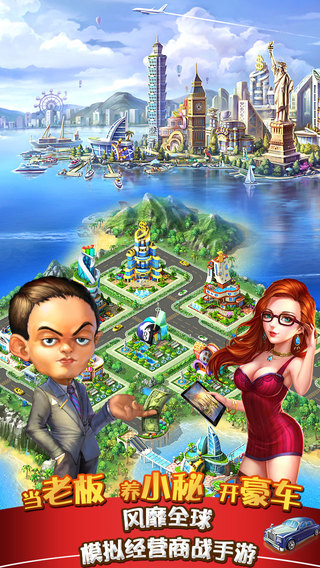 《大富豪2》是一款创新的模拟经营游戏,颠覆传统模拟经营模式。游戏中你不仅仅是一个精打细算的经营者,更是一个在商海中游刃有余掌控全局的战略家。诸多建筑,数不尽的店铺,尽情挥洒,缔造自己的商业帝国。玩股票、搞国际贸易那都是小儿科,请比尔盖茨来帮你打工那才是真的赞!驾着豪车带着美女秘书去环游世界,实现你想都不敢想的伟大梦想。决战商海、制霸全球才是真富豪!