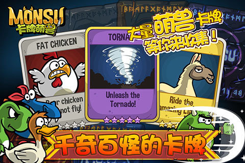 《卡牌萌兽》是一款融合策略卡牌等元素的创新型跑酷手游。区别于传统跑酷,该游戏提供给玩家更广阔的战术发挥空间,凭借自身装备的卡牌组合特点,任何人都 可以打出华丽的全攻流、猥琐的防守流,甚至只求分数不要命的技术流。另外,《卡牌萌兽》研发团队来自大名鼎鼎的“愤怒的小鸟”主创人员,所以乍看之下会有 似曾相识的感觉。