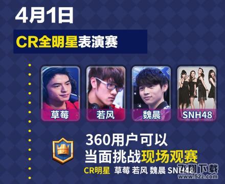 4月1日《皇室战争》全明星表演赛将正式拉开序幕,女子偶像天团SNH48、魏晨、草莓、若风等明星选手将展开一场场精彩对决。现在通过360手机助手预约下载游戏,即有机会当面挑战诸位明星,更有机会现场零距离与偶像接触,实时观看本次明星表演赛。360游戏将送出50张现场观赛门票,及一个珍贵的上台对战名额。苹果手机用户也可免费关联至360游戏平台,参与本次《皇室战争》明星表演赛活动。