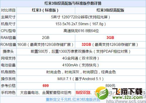 红米3标准版与指纹高配版的区别并不多,通过对红米3的两个版本详细参数对比,我们就可以秒懂了,参数对比如下:
