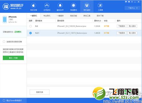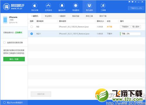 3、选择固件版本iOS 9.2.1,然后点击右下方“立即刷机”,点击之后爱思助手会自动帮您下载官方固件并进行刷机。耐心等待刷机完成即可。
