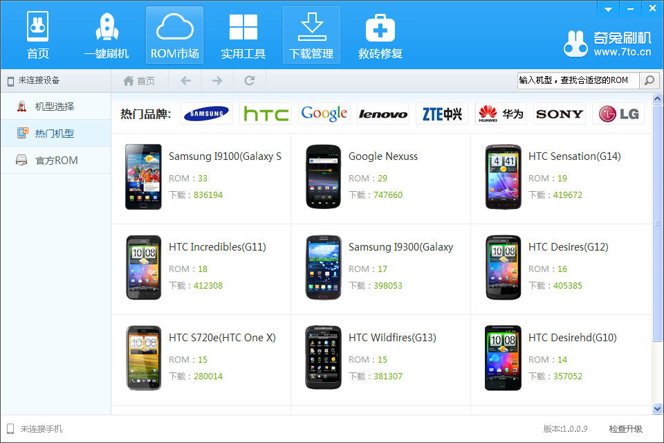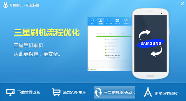 奇兔刷机是由深圳市奇兔软件技术有限公司研发的一款安卓刷机工具,致力于降低普通安卓用户的刷机技术门槛,从而提升安卓手机用户的使用体验,目前已支持三星,HTC,SONY,华为,中兴等数个品牌的数十款机型,新增救砖修复模块,在用户手机无法开机的情况.通过奇兔刷机工具可以恢复正常使用。