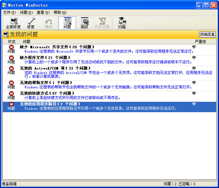 从 Norton SystemWorks 简体中文版光盘中提取出来的,经测试可正常使用。主要用来修复注册表的一些错误和死链接以及无效的快捷方式等,而这些问题是软件特别是一些大型软件在安装、覆盖、卸载过程中产生的,会严重影响系统的运行速度。用 WinDoctor再配合使用其它的注册表、文件夹清理软件,定时进行磁盘碎片整理,系统完全可以在长时间内保持良好的运行状态。