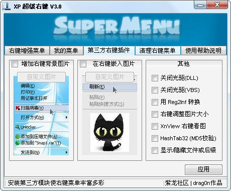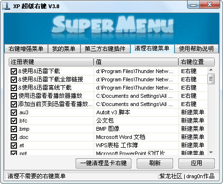 XP超级右键,是一款实用的右键菜单管理工具,功能强大!可以在右键上自定义增加/删除菜单、自定义增加图片美化菜单.软件自带了常用的菜单选项,直接选择就可以使用.