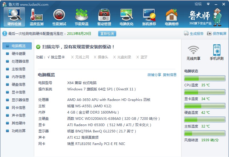 鲁大师拥有专业而易用的硬件检测,不仅超级准确,而且向用户提供中文厂商信息,让用户的电脑配置一目了然,拒绝奸商蒙蔽。它适合于各种品牌台式机、笔记本电脑、diy兼容机,实时的关键性部件的监控预警,全面的电脑硬件信息,有效预防硬件故障,让用户的电脑免受困扰。鲁大师帮用户快速升级补丁,安全修复漏洞,系统一键优化、一键清理、驱动更新。更有硬件温度监测等带给用户更稳定的电脑应用体验