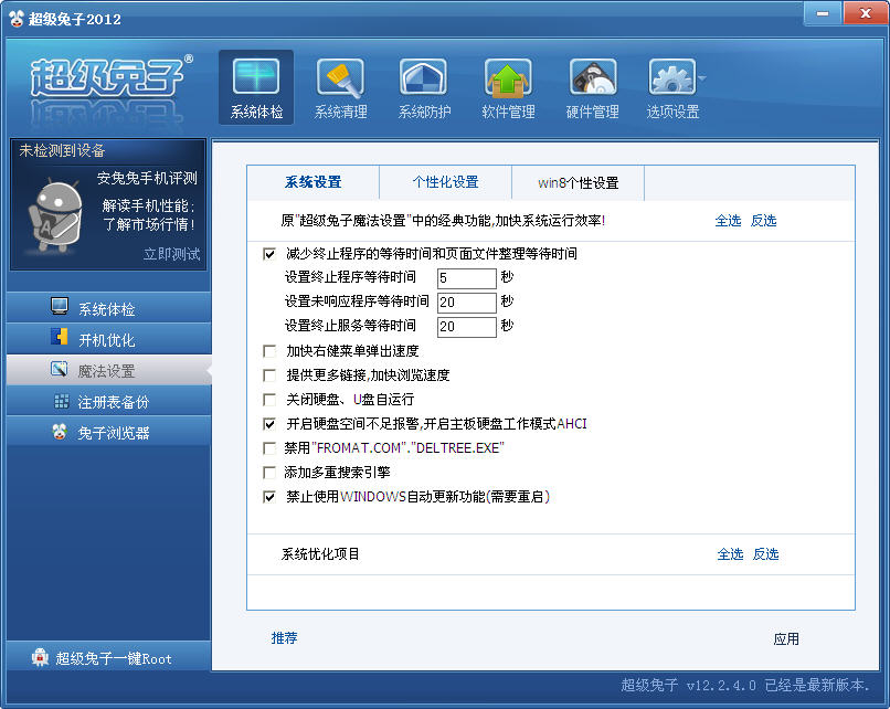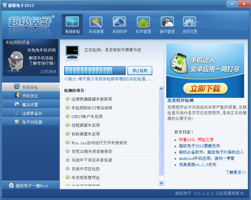 超级兔子是一款拥有超过10年的电脑功能辅助软件,可助用户轻松辨别硬件的运作状态、安装硬件的驱动程式、维护系统安全、安装系统补丁及软件升级、优化系统功能、清除系统的多余文件、提升电脑速度、保护IE安全、监测危险程序的软件。 【软件功能】 超级兔子上网精灵具有IE修复、IE保护、恶意程序检测及清除工能,还能防止其它人浏览网站,阻挡色情网站,以及端口的过滤。 超级兔子系统检测可以诊断一台电脑系统的CPU、显卡、硬盘的速度,由此检测电脑的稳定性及速度,还有磁盘修复及键盘检测功能。超级兔子进程管理器具有网络、进程、窗口查看方式,同时超级兔子网站提供大多数进程的详细信息,是国内最大的进程库。超级兔子安全助手可能隐藏磁盘、加密文件,超级兔子系统备份是国内唯一能完整保存Windows XP/2003/Vista注册表的软件,彻底解决系统上的问题。 注:由于体积的关系,标准版没有提供桌面秀、磁盘加速器等工具,如要使用这些组件,请下载专业版。如系统已装有旧版兔子,请不必卸载旧版,直接安装标准版也可以升级为专业版。 更新说明: 1.加入新版魔法设置. 新版魔法设置去掉了旧版中的部分在XP和WIN7中已经失效的功能. 2.加入开机时间检测. 3.将"恶意网址修复"整合到"恶意程序卸载"面版中, 并加入"流氓快捷方式"清理功能. 4.修复软件管理软件下载功能中偶尔无法正常读取软件下载链接的问题. 5.调整系统痕迹清理的界面. 6.调整兔子软件首页界面结构 7.调整系统防护首页界面结构