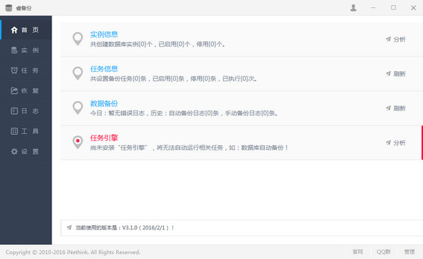 V3.3.1(2016/04/29) 1. 新增“文件备份”功能,可自由备份本地或远程文件; 2. 修复“工具”中的插件在某些系统环境下无法启动; 3. 优化系统性能; 4. 修正 BUG。 V3.2.0(2016/03/21) 1. 增加在线升级功能; 2. 改进系统设置界面布局、用户登录界面; 3. 自有云支持“七牛云存储”,用户可专享七牛充值优惠码:dd3eaa8f; 4. 网络传输支持“域模式”连接; 5. 修正 BUG。 V3.1.0(2016/02/01) 1. 优化对 Linux 下的 Oracel 备份; 2. 修正获取当前 MySQL 数据库的方法; 3. 支持 MySQL 5.7 的备份与恢复; 4. 支持 PostgreSQL 9.5 的备份与恢复; 5. 修正 BUG。