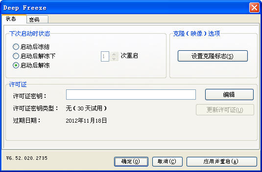 安装了Deep Freeze的系统,无论进行了安装文件还是删除文件、更改系统设置等操作,计算机从新启动后,一切将恢复成初始状态,对学校机房、网吧等好处是不言而喻的。