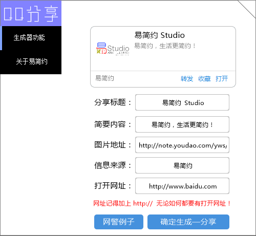 点击下方的“网警例子”就会出现下方窗口,基本上所有内容都不需要改,然后点击【确定生成分享】即可通过QQ分享给你的好友或者群