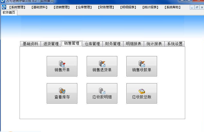 报表中心:日、月、年报表、客户销售排行榜、商品利润报表、客户利润统计、职员销售业绩、采购、销售明细统计报表、收款、付款明细报表、进销存出入库明细报表