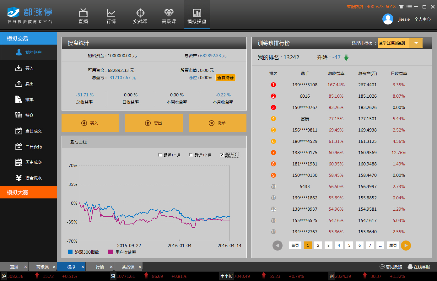 2、模拟操盘:注册即赠100W模拟金、支持模拟操盘班级训练模式、支持模拟比赛;支持沪深A股(中小板、创业板),交易数据源自真实股市,贴近实盘;支持每日、每周、每月收益率统计,每日操盘业绩统计、个人盈利曲线等操盘分析;