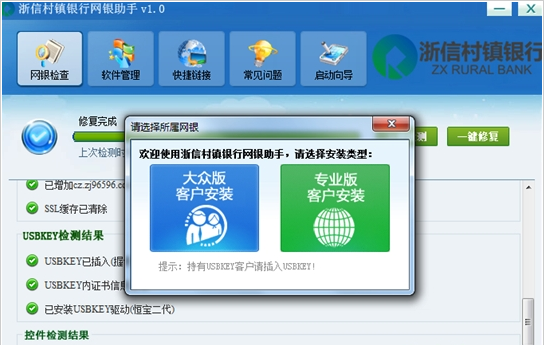 在使用浙信村镇银行的过程中,您可随时通过网银助手进行检测并一键修复。您还可以在网银助手“软件管理”菜单内,分别安装控件、驱动程序,调整您的计算机设置。