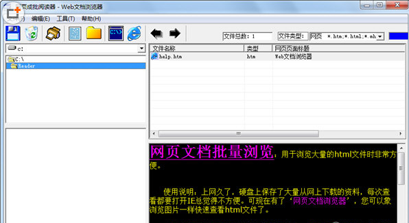 网页成批阅读器可以阅读本地下载的html网页,不用再打开IE浏览器就可以进行轻松浏览,象浏览图片一样快速查看html文件,网页成批阅读器是是一个能够批量浏览html文件的软件,上网久了,硬盘上保存了大量从网上下载的资料,每次查看都要打开浏览会觉得不方便。那么你就可以用这个网页批量浏览软件来快速浏览。