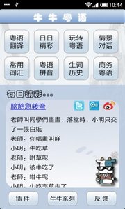 2、粤语拼音、粤语发音,地道纯正;   3、整句翻译、真人发音,支持从浏览器选取文字通过分享直接翻译;   4、21类常用词汇、13类生活场景涵盖工作、生活、社交等各个方面;   5、俗语、口头禅、歇后语、绕口令助你成为粤语达人,玩转粤语;   7、日日精彩,潮爆粤生活;   8、边讲边录、纠正发音,练就最地道的广东话。