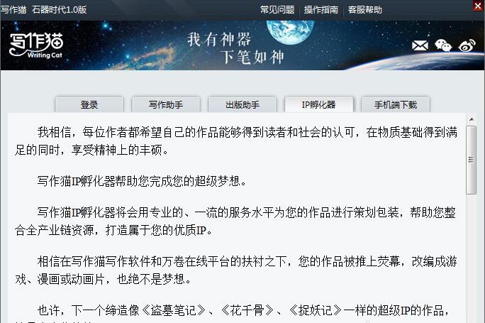 帮助:小说、剧本、杂文等模块功能介绍以及本公司对作家提供增值服务介绍包括电子出版、按需出版、IP孵化器、手机端写作猫下载 二维码;