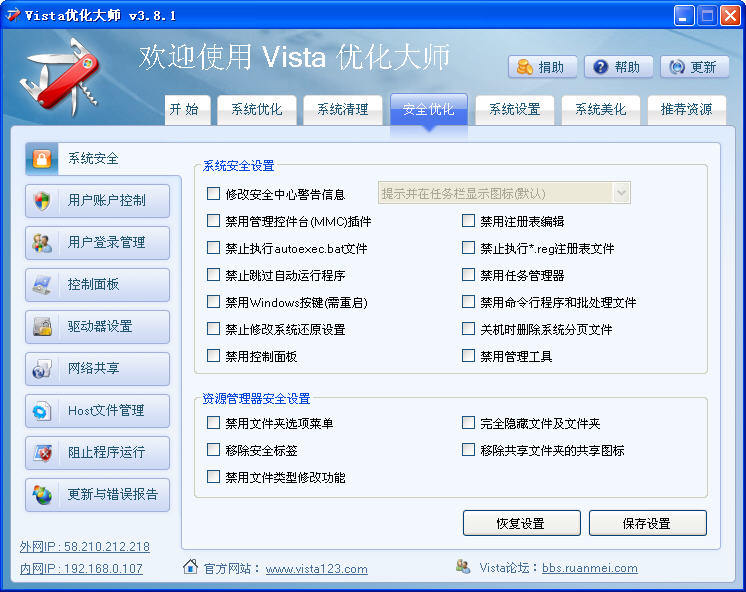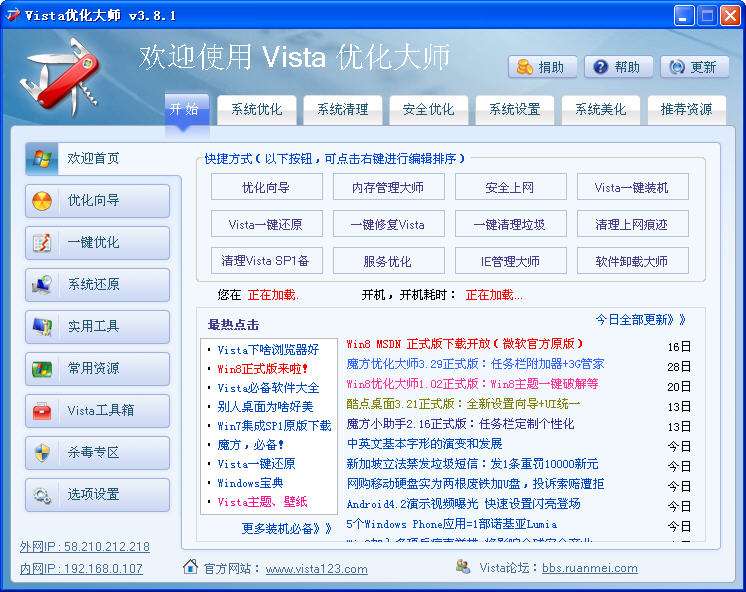 Vista优化大师(Vista Master),中国国内用户量第一的Vista系统优化设置软件,中国国内第一个专业优化微软Windows Vista的超级工具,当然,也是最好的Vista优化设置和管理软件!美化、优化、设置、安全超多功能,一软在手,Vista无忧。