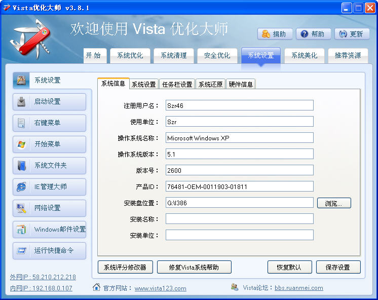 全新的版本3.76来了,根据大家的反馈,加入了选项设置功能,可以设置开启Vista优化大师时是否运行优化向导和还原点设置提示等等,同时,和同门的师兄弟Win7优化大师一样,提供了开机时间探测功能。