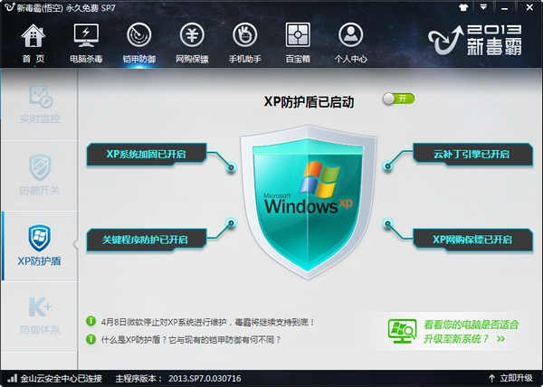 金山毒霸今日发布新版本,增加了定制的XP防护盾,在4月8日微软停止对Windows XP的技术支持之后,继续保护XP用户安全。金山毒霸XP防护盾在现有铠甲防御的基础之上,强化了针对Windows XP的特有保护。它通过分析Windows XP系统中以往的漏洞攻击手法,对可能被利用的系统弱点进行针对性保护,可最大限度地防止系统和常用软件遭受漏洞攻击。