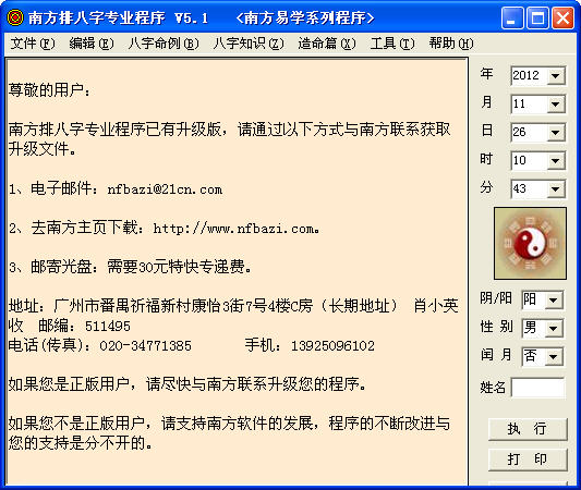 本软件可排出八字、大运、十神、小运、命宫、胎元,找出神煞、起运岁数、岁运并临等信息