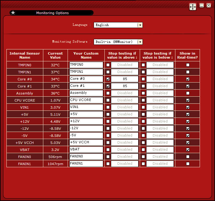 从网上下载到MBM5和OCCT两个黄金搭档后,先进行安装,安装过程无须多说,一路点击Next即可。在利用OCCT进行测试前必须先对MBM5进行设置,只有MBM5测得的数据准确才能得到可靠的OCCT测试数据。