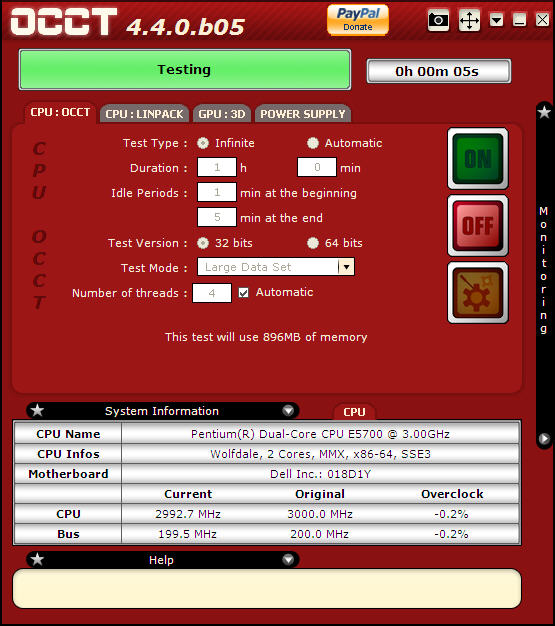 设置完毕后,点击“Go Back”返回到主界面,再点击左下方的“Test“键就可对电源进行测试了。测试将进行30分钟,由于测试时OCCT将占用大量的系统资源,因此此时最好不要进行其他操作(屏幕保护程序也要先取消),否则将导致测试失败。我们可以通过OCCT的监测面板上看到电源各路输出电压的波动情况,需要注意的是无论是电源还是CPU散热等情况有一样不妥的话,OCCT都会在测试中自行退出。