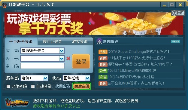 6、双线互联:11对战平台特设双线专区,支持所有电信、网通玩家一起共同进行游戏,不再为网络问题而烦恼,就连校园网都能够支持,实乃历史一大突破。