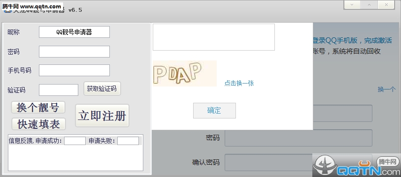 天龙QQ靓号申请器是一款专门帮助QQ用户一键申请QQ靓号的软件,这款软件可以后台模拟人工方式提交申请QQ号码,通过自动输入验证码等相应的验证条件,从而达到成功申请QQ靓号目的。天龙QQ靓号申请器操作简单,用户只需填写申请QQ的一些基本信息即可提交申请,需要的朋友快来下载使用吧!