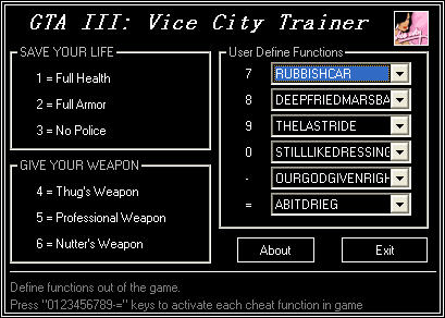 使用方法:运行程序前,先运行作弊器,(不要退出)然后再启动游戏。在游戏中按 1234567890-= 键(键盘主区第一行),就自动向游戏中输入事先定义好的相应的作弊码。 1 2 3 4 5 6 六个键已经预定义好了相应的功能:1. 生命值全满, 2. 装甲满, 3. 通缉级别为0, 4. 得到暴徒武器, 5. 得到专业武器, 6. 得到疯狂武器。 其他功能用户可以自己通过程序界面自行定义到 7890-= 键上。