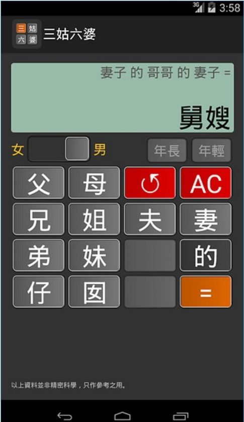 这款计算器用“父”“母”“兄”“妻”等称谓代替了普通计算器上的数字按键,不知道如何称呼亲戚时,只要输入比较亲密的血缘关系,再层层叠加就好了。