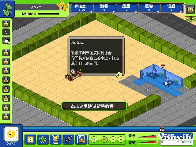 《帝国度假村》作为一款经营类游戏,你的目的就是让你的度假村设施更加完善,赚更多的Money,当然建造房屋,铺设道路,种植各种植被等等元素游戏都有包含。在游戏开始时会有个游戏教学,可以让玩家少走许多弯路。游戏的游戏中玩家可自由调节游戏的进度。游戏已经汉化,尽管功能提示界面,各个按钮排列的比较密集,玩家只要略微查看即可明白各个板块的作用。