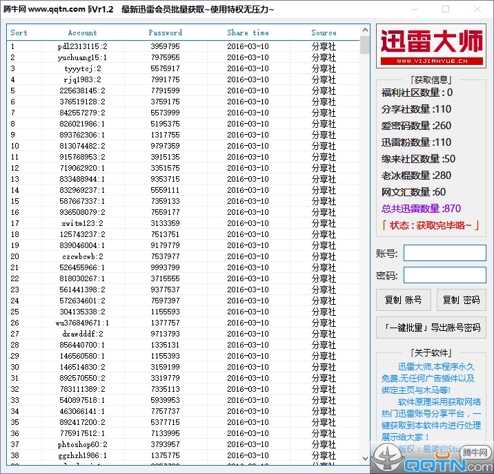 易简约迅雷大师是一款2016年最新的迅雷vip会员获取器,这款软件可以帮助你一键批量获取迅雷vip账号和密码,帮助你免费享受会员特权,无需充值即可享受迅雷会员特权了,不管是离线下载还是高速下载统统都可以,本程序永久免费,无任何广告插件以及绑定主页与木马等,欢迎下载体验!