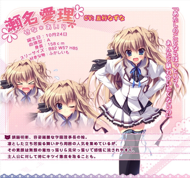 游戏故事讲述的是为人着想而爱操心的主人公·瓜生新吾,他所就读的学校将要和同一个地区的某名门女校合并。从10月起的半合并期间,新吾作为混合学习的选拔生的一员而开始在女校上学,在那里等待着他的是与个性丰富的少女们的邂逅、对男性的拒绝反应。新吾为了使气氛更加和谐而忙碌,在这期间…… 恋爱的颜色是白色。能够被“二人的色彩”所浸染的、纯真无垢的白色。