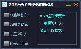 DNF速杀全屏秒杀辅助是一款专为广大DNF玩家打造的最新免费DNF全屏秒杀辅助,这款辅助不仅可以帮助玩家在游戏中开启全屏秒杀,同时还支持随身仓库、三S评分、无限负重等辅助功能,有了这款辅助,玩家就能一键快速刷图了,为大家降低游戏难度,轻松通关。喜欢玩DNF的朋友快来试试这款辅助吧!