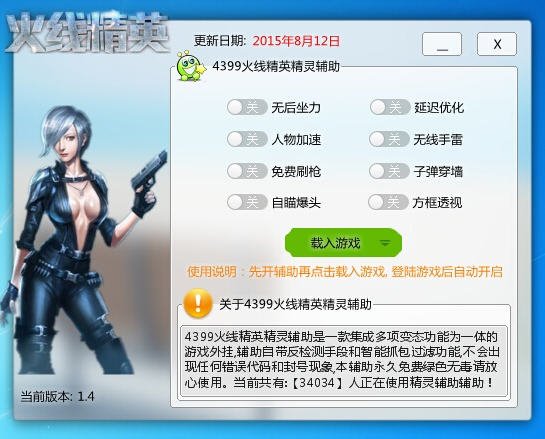 4399火线精英精灵辅助(4399火线精英方框透视)是一款针对4399火线精英开发的火线精英辅助工具。无限防踢 方框透视 人物加速 无后坐力 子弹穿墙 远程飞刀,一键秒杀全屏所有敌人。