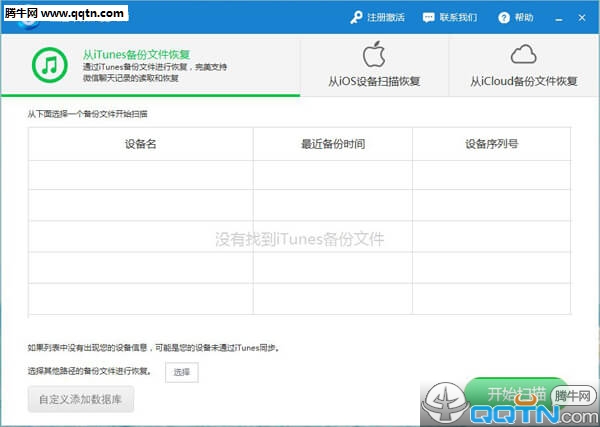 2、点击“从iTunes备份文件恢复”,再点击左下方的“选择”或是“自定义添加数据库”。