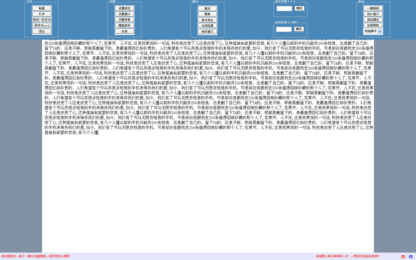 锁定:你可以设定锁定的时间或者字数,在未达到您限定的时间或字数之前,你将不可以退出这个软件,即便关机重启亦如此。